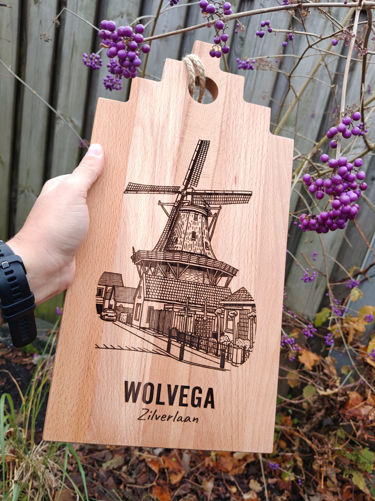 Gepersonaliseerde borrelplank in de vorm van een huisje met gravure