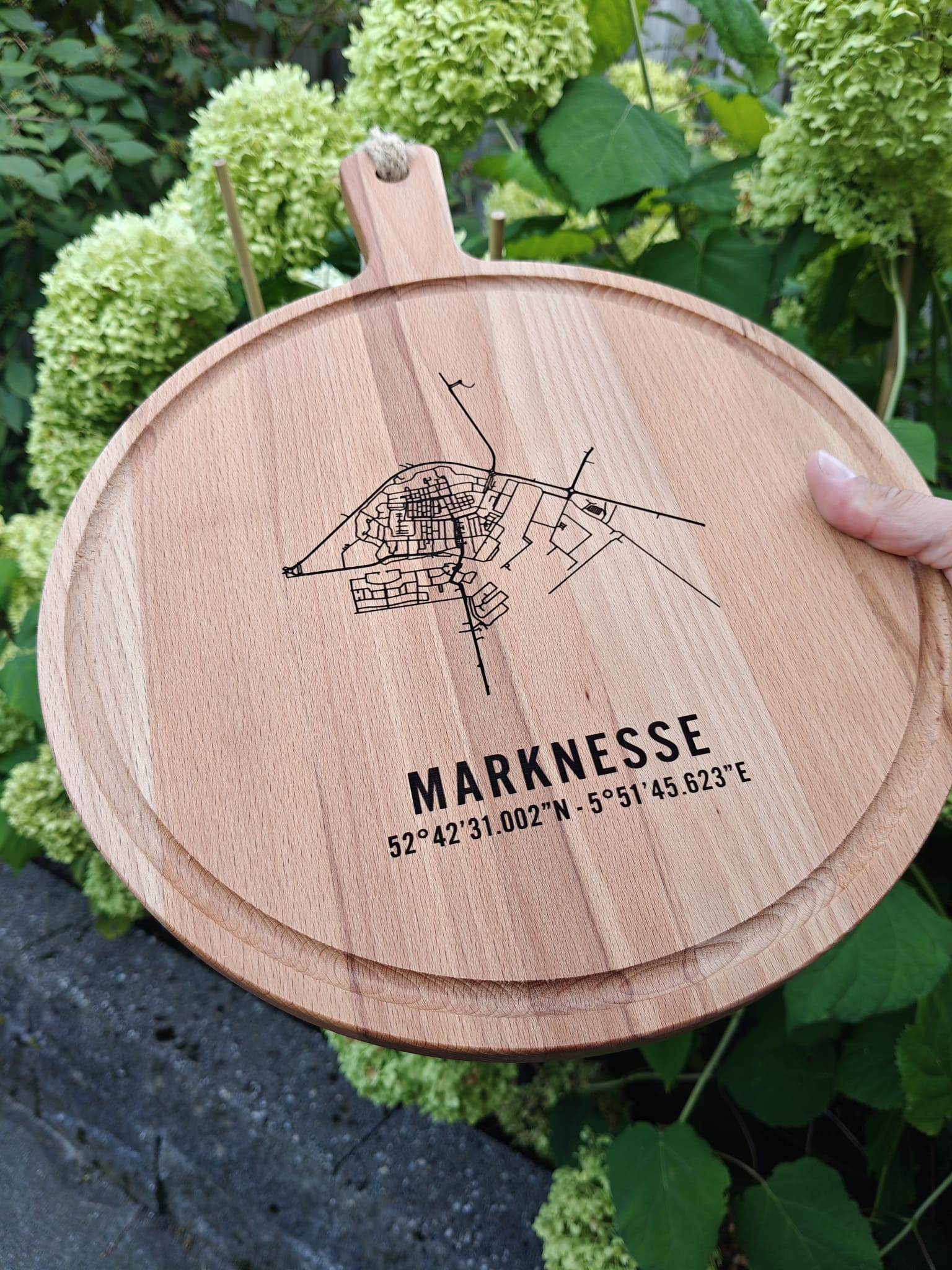 Ronde houten borrelplank (30 cm) met de gegraveerde plattegrond, coördinaten en plaatsnaam Marknesse. Uniek design, ideaal als cadeau of sfeervolle serveerplank.